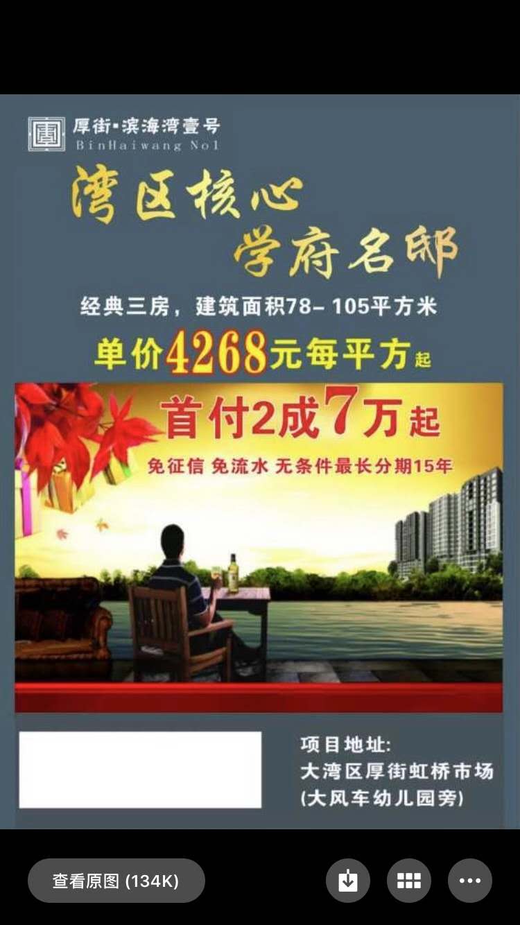 东莞厚街虹桥市场旁《滨海湾壹号》统建楼出售,首付7万买大三房,可分期15年